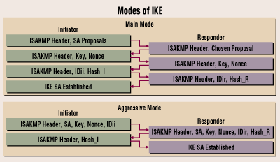 Aggressive Mode squeezes the IKE SA negotiation into three packets, with all data required for the SA passed by the initiator. The responder sends the proposal, key material and ID, and authenticates the session in the next packet. The initiator replies by authenticating the session. Negotiation is quicker, and the initiator and responder ID pass in the clear.